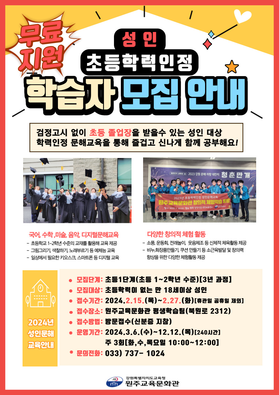 □ 원주교육문화관은 올해에도 신입생을 모집하여 3월부터 초등학력인정 문해교육(1단계) 과정을 운영하며 자세한 내용은 문헌정보과(☎033-737-1024)로 문의하면 된다.