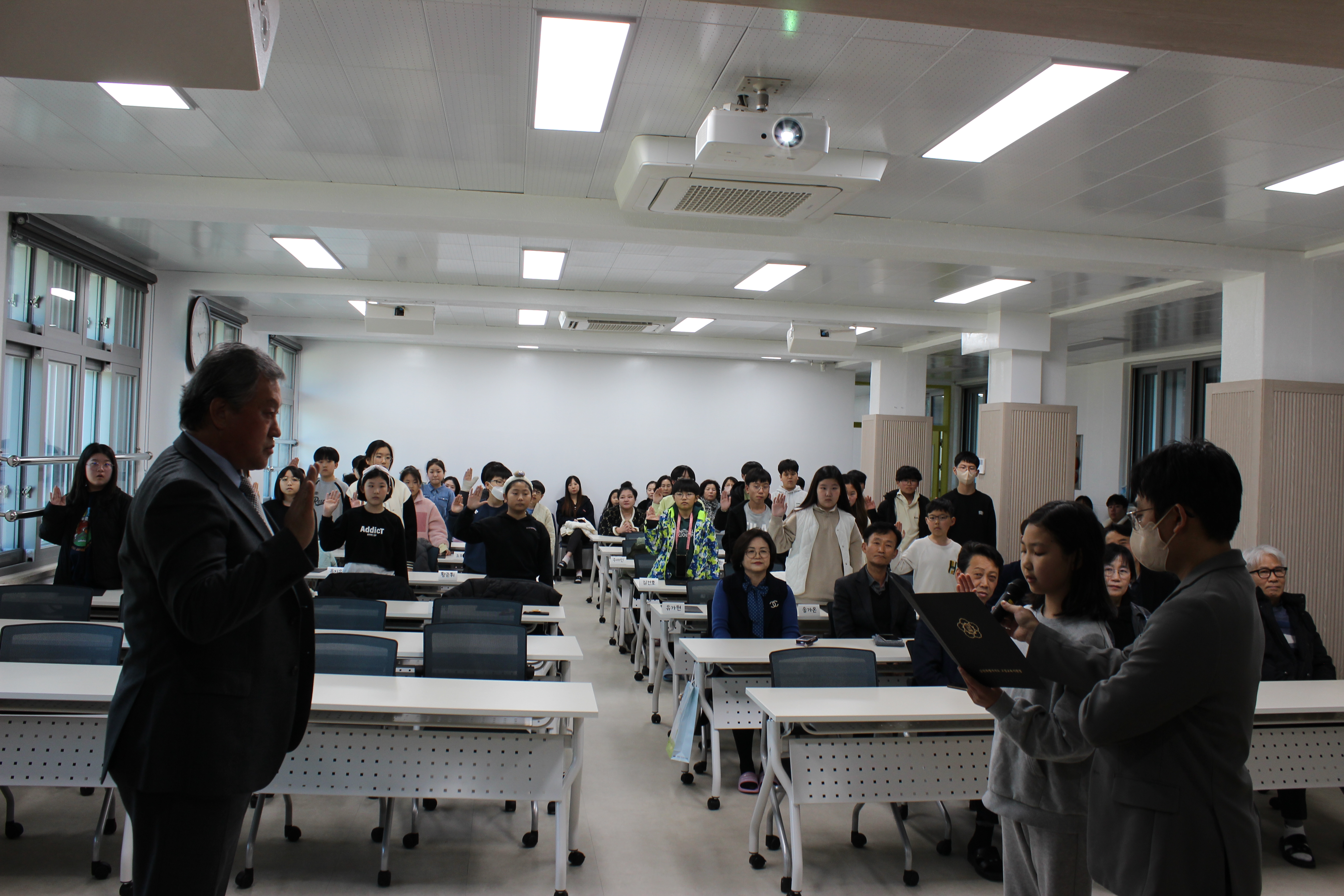 □ 이날 개강식은 학생들의 입학 허가서 전달과 입학생 선서, 지도교사 위촉장 수여와 영재교육원장이신 허욱 교육장님의 환영사로 이어졌다. 개강식 후에는 학부모의 영재교육 이해를 돕기 위한 교육과정 설명회와 학생들의 영재교육원 적응력 향상을 위한 오리엔테이션도 함께 진행됐다.