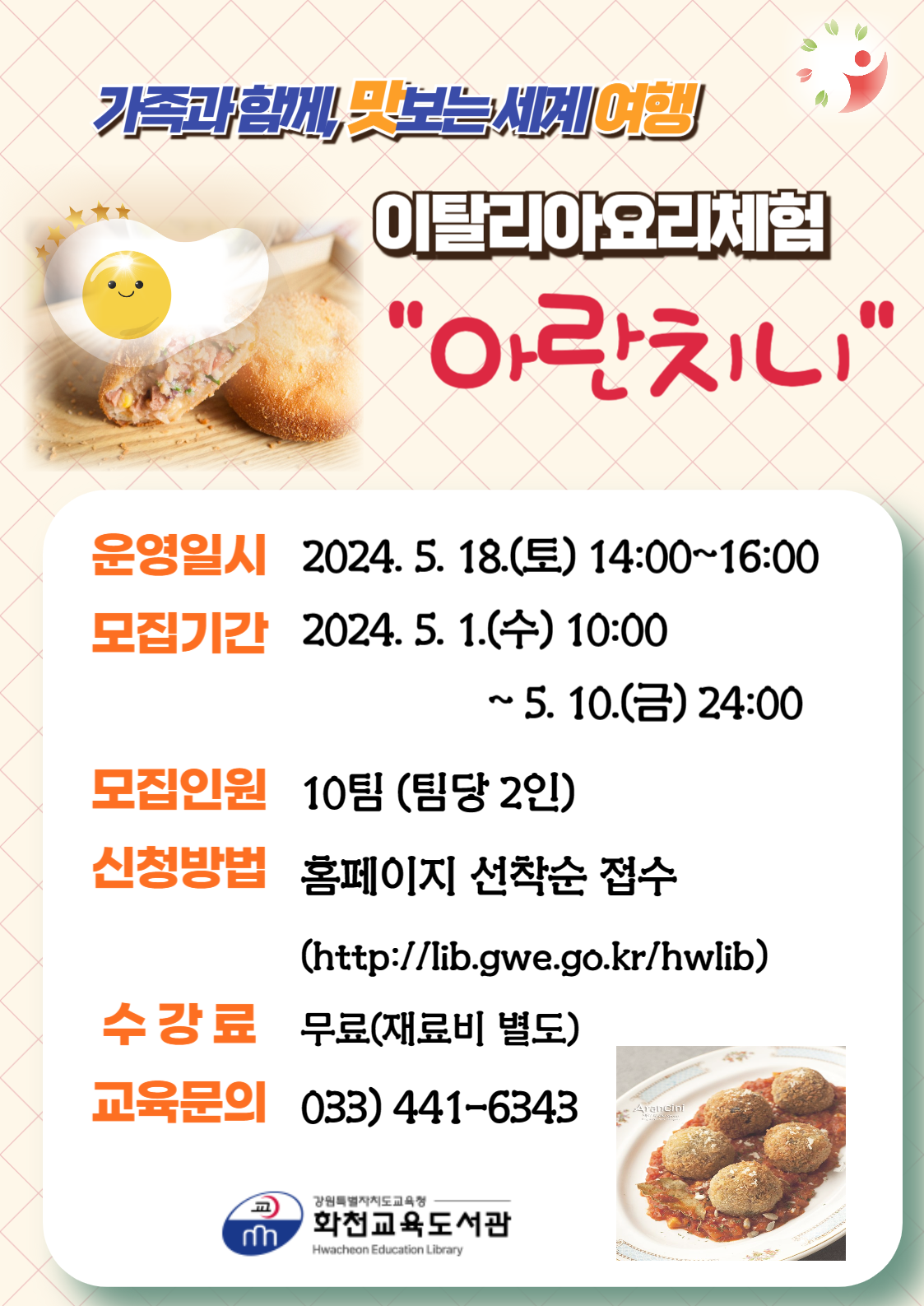 □ 화천교육도서관(관장 양재현)은 군민을 대상으로 2024년 5월 평생학습 주말 특강 「맛보는 세계여행, “아란치니”이탈리아 요리체험」을 운영한다.