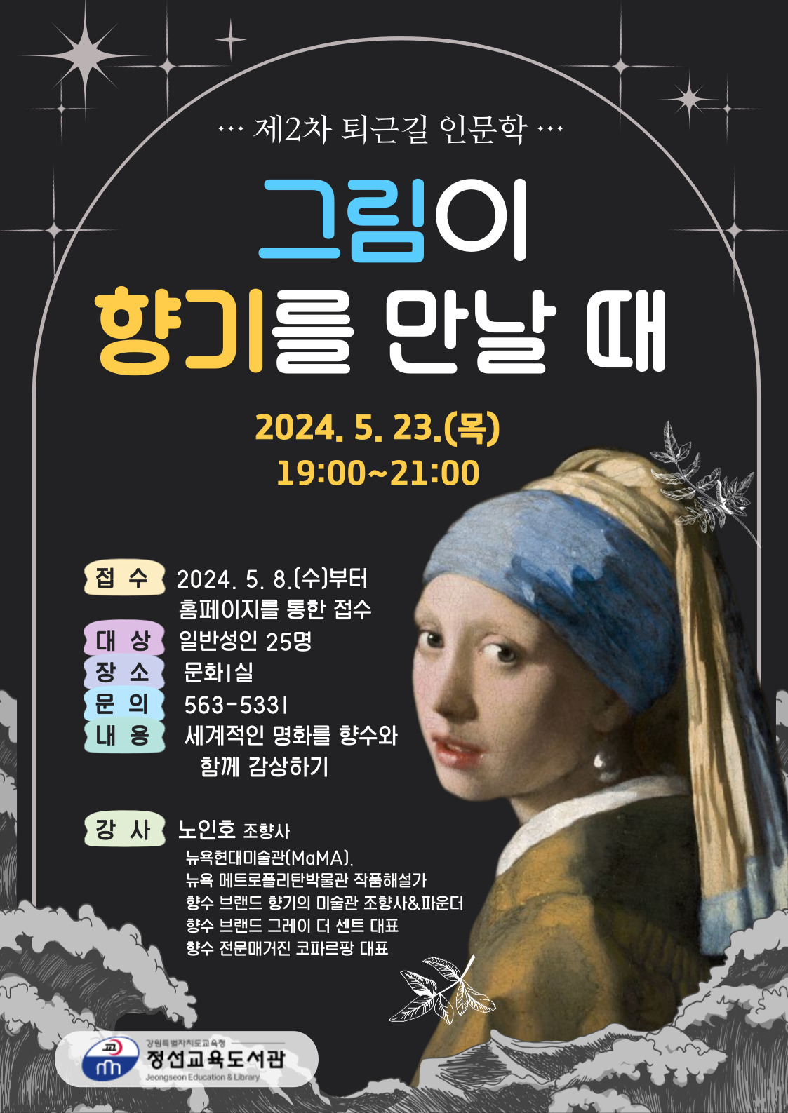 □ 정선교육도서관(관장 권예순)은 오는 5월 23일 직장인, 일반성인을 대상으로‘그림이 향기를 만날 때’를 주제로「제2차 퇴근길 인문학」을 운영한다.