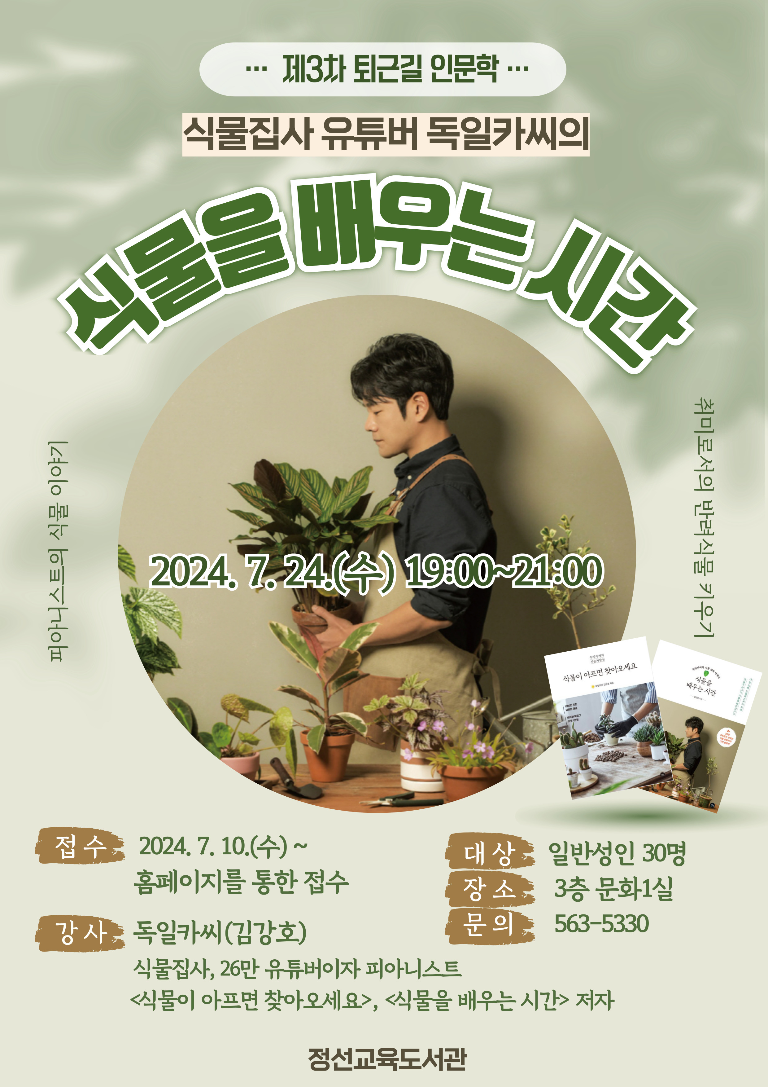 ◦ 이번 강연은 피아니스트이자 식물집사 유튜버, 도서「식물이 아프면 찾아오세요」의 저자인 김강호(독일카씨) 강사가 진행한다.