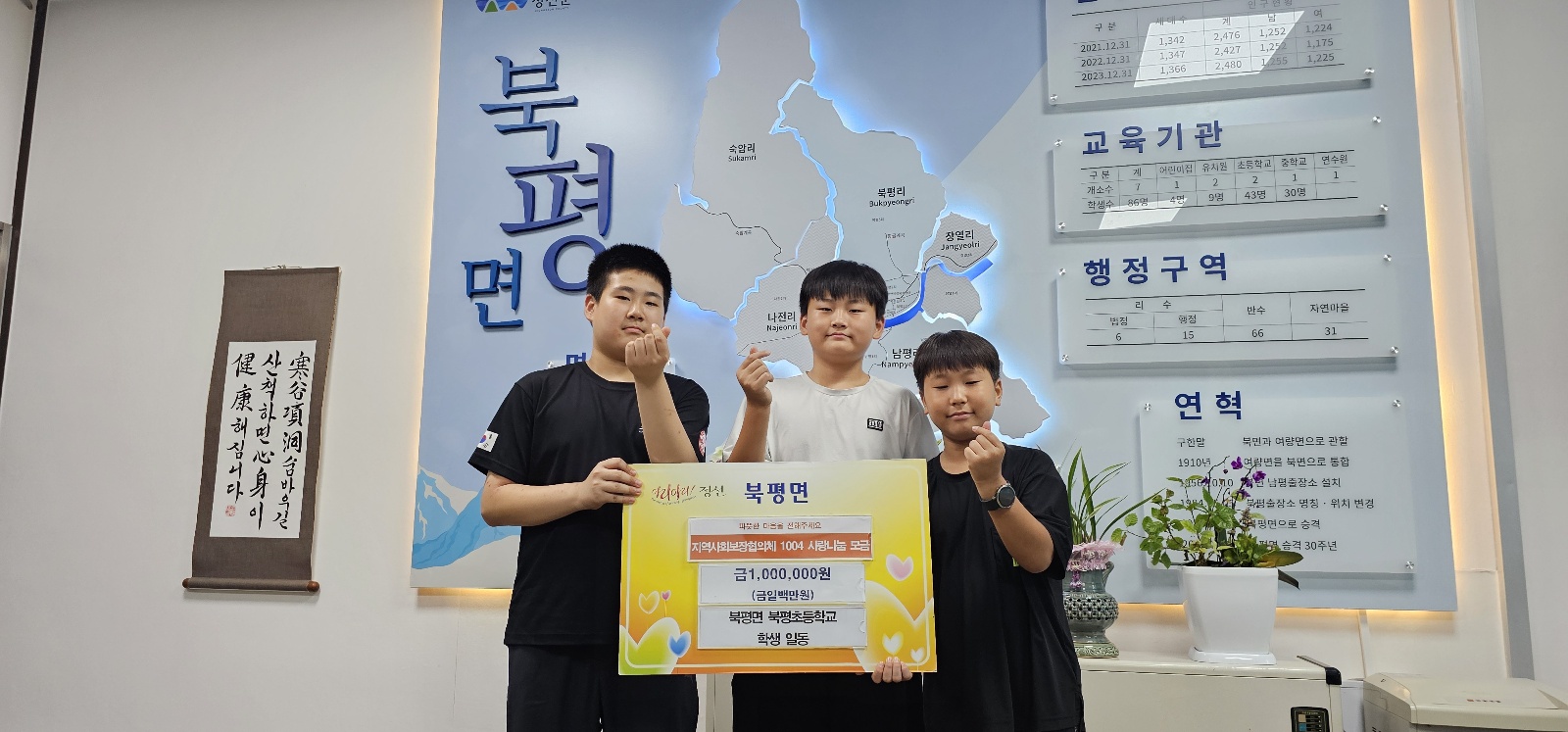 ◦ 수익금 180만원 중 100만원은 북평면행정복지센터에 기부하여 북평면 관내 어려운 가정을 위해 사용되며, 50만원은 글로벌 아동권리 전문 단체인 굿네이버스에 기부하였고, 나머지 30만원은 국제환경단체인 그린피스에 기부하여 지구 환경을 지키는데 작은 힘을 보태기로 하였다.