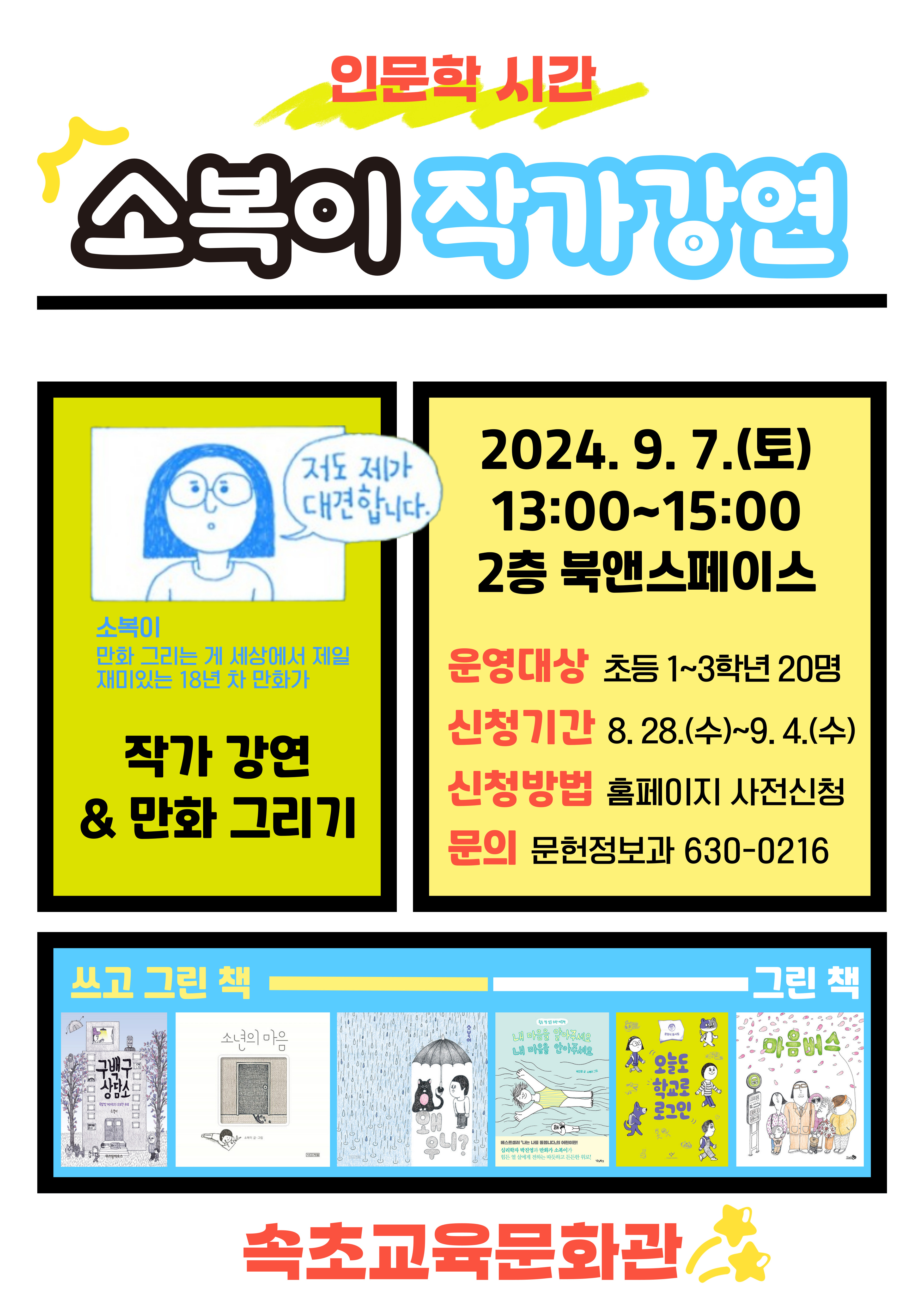 □ 올해 ‘인문학 시간’의 세 번째 강연자로 나선 소복이 작가는 『왜 우니?』, 『소년의 마음』 등을 쓰고 그렸으며, 이 외에도 『마음버스』, 『오늘도 학교로 로그인』 등 다양한 책의 일러스트 작가로도 활동하고 있다.