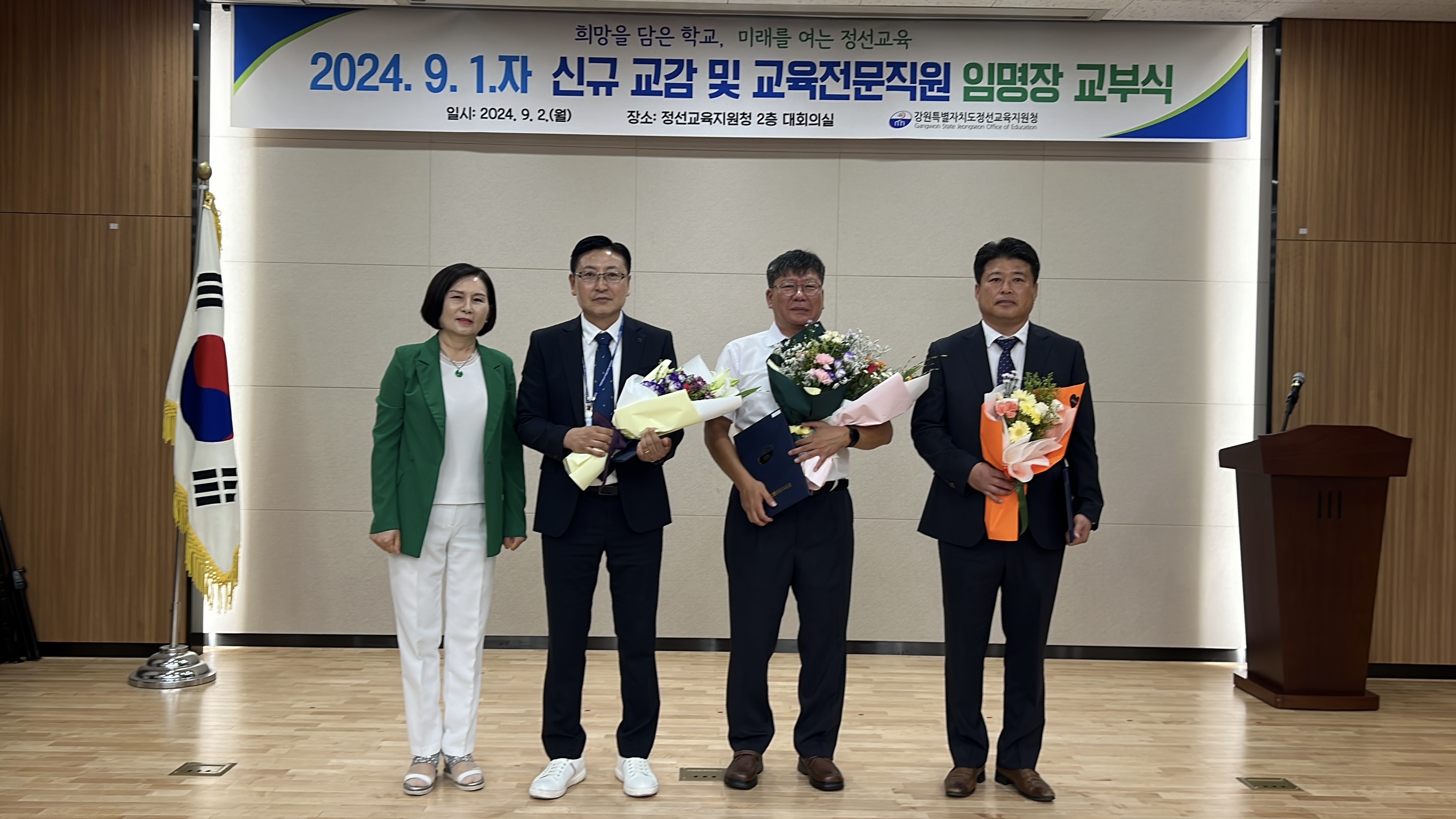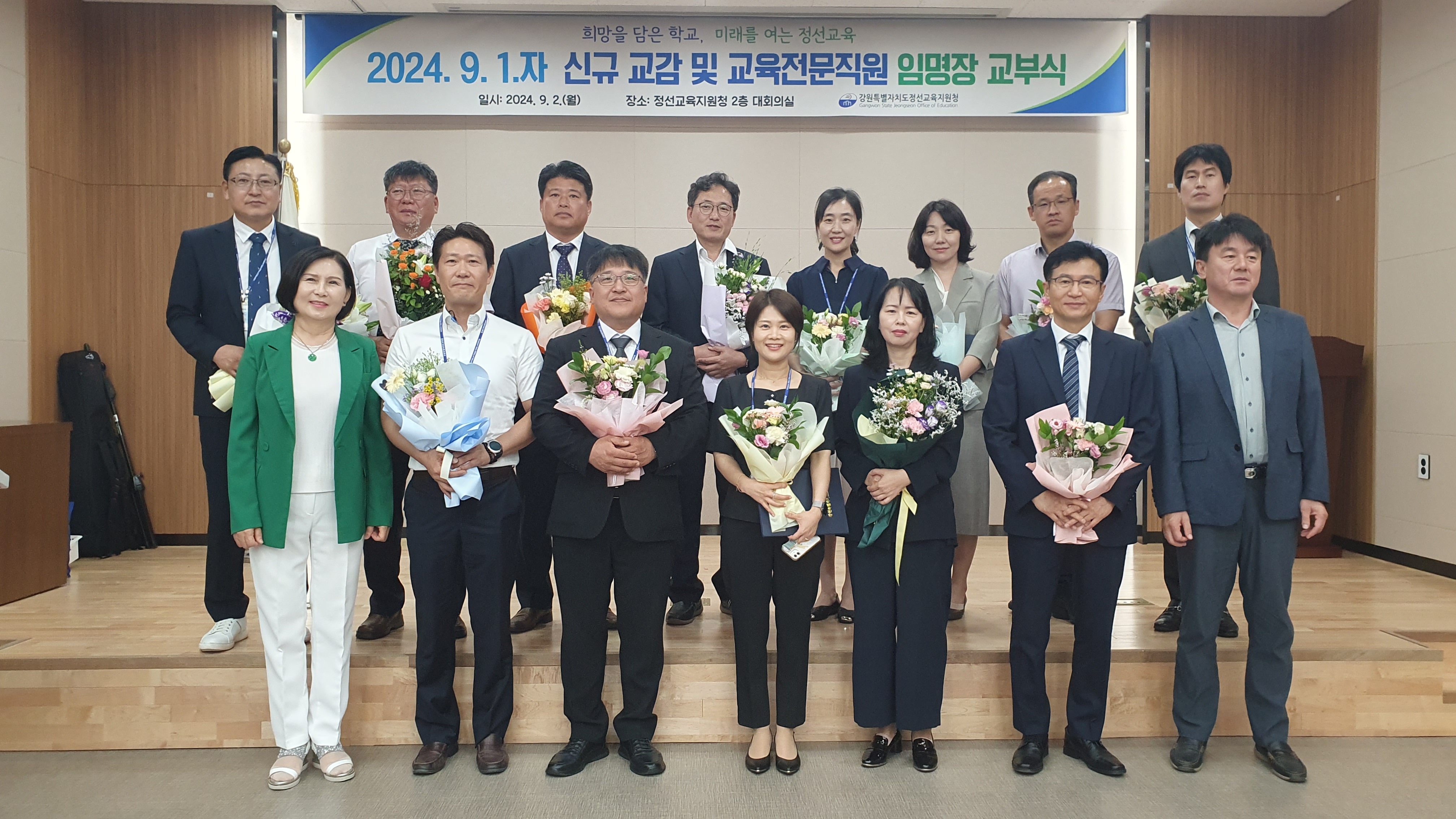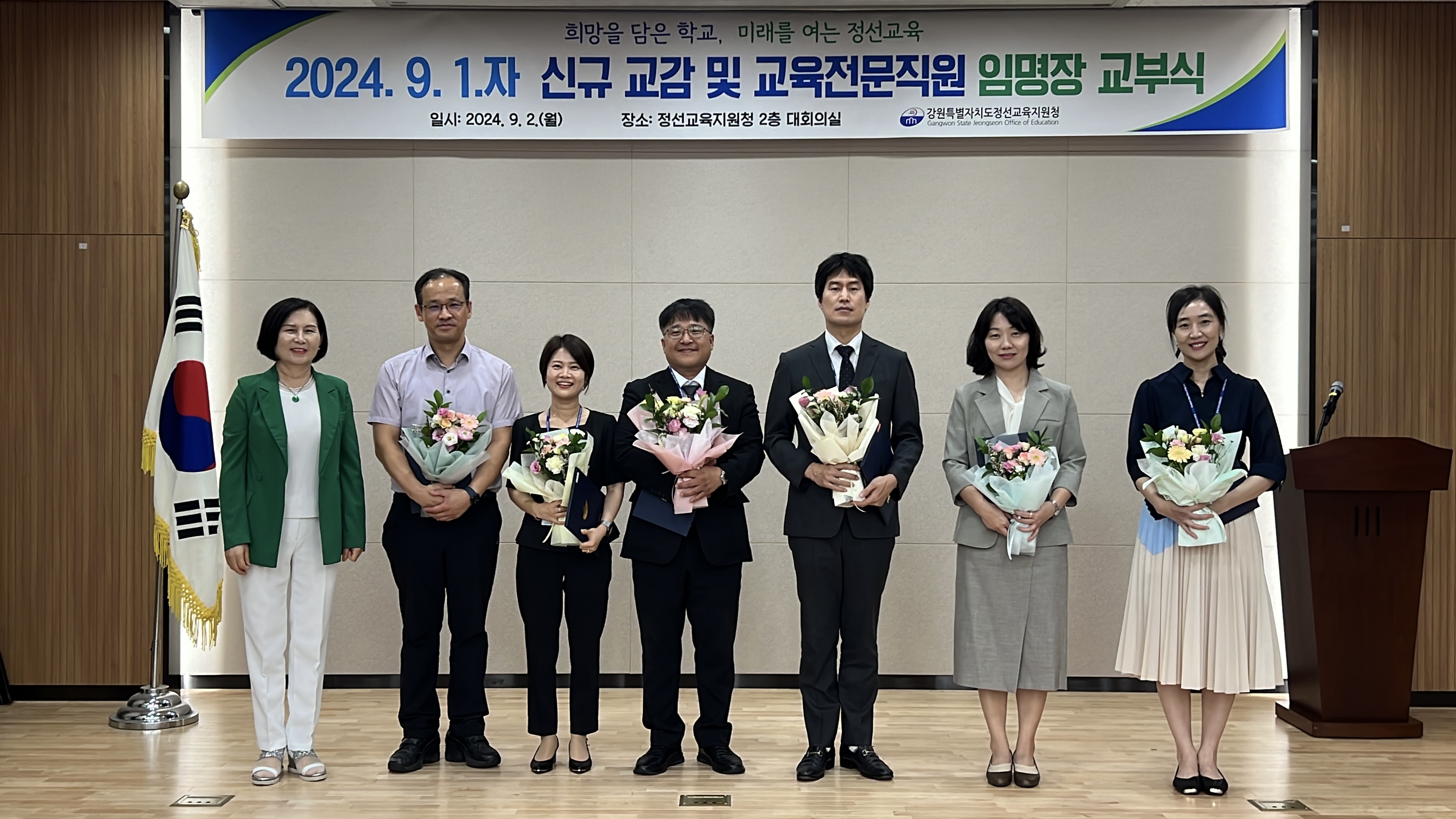 □ 강원특별자치도정선교육지원청(교육장 신동란)은 9월 2일(월)에 2024. 9. 1.자 신규 교육공무원에 대한 임명장 교부식을 가졌다. 이날 교부 대상자는 정선에 신규 부임한 초, 중등 교감 및 교육전문직원 등 모두 12명이다. 신동란 교육장은 “바른 품성과 실력을 갖춘 창의 인재 육성을 위해 모두가 맡은 자리에서 열정으로 업무에 임해달라”고 당부했다.