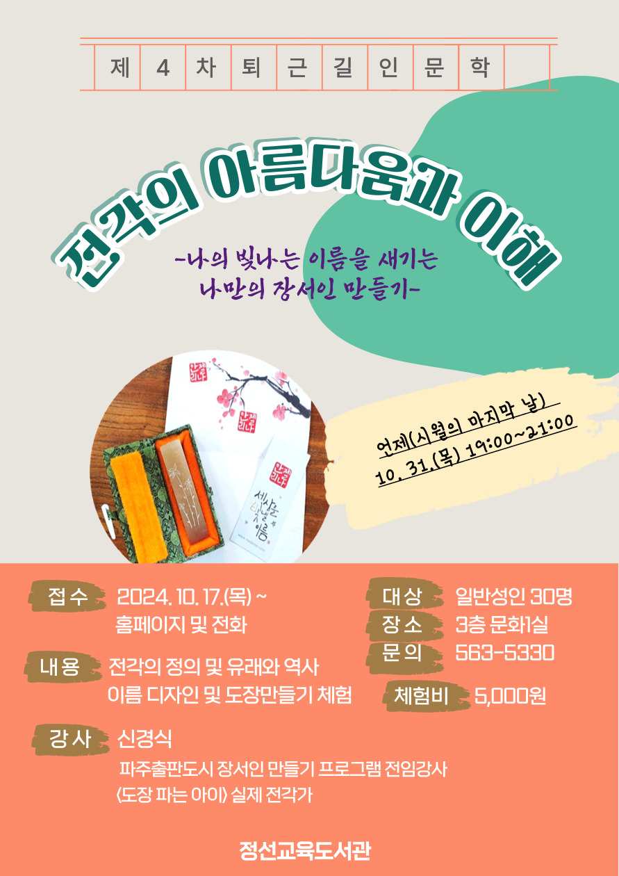 □ 정선교육도서관(관장 권예순)은 오는 10월 31일 직장인, 일반성인을 대상으로제4차 퇴근길 인문학「전각의 아름다움과 이해」나만의 장서인 만들기를 운영한다.