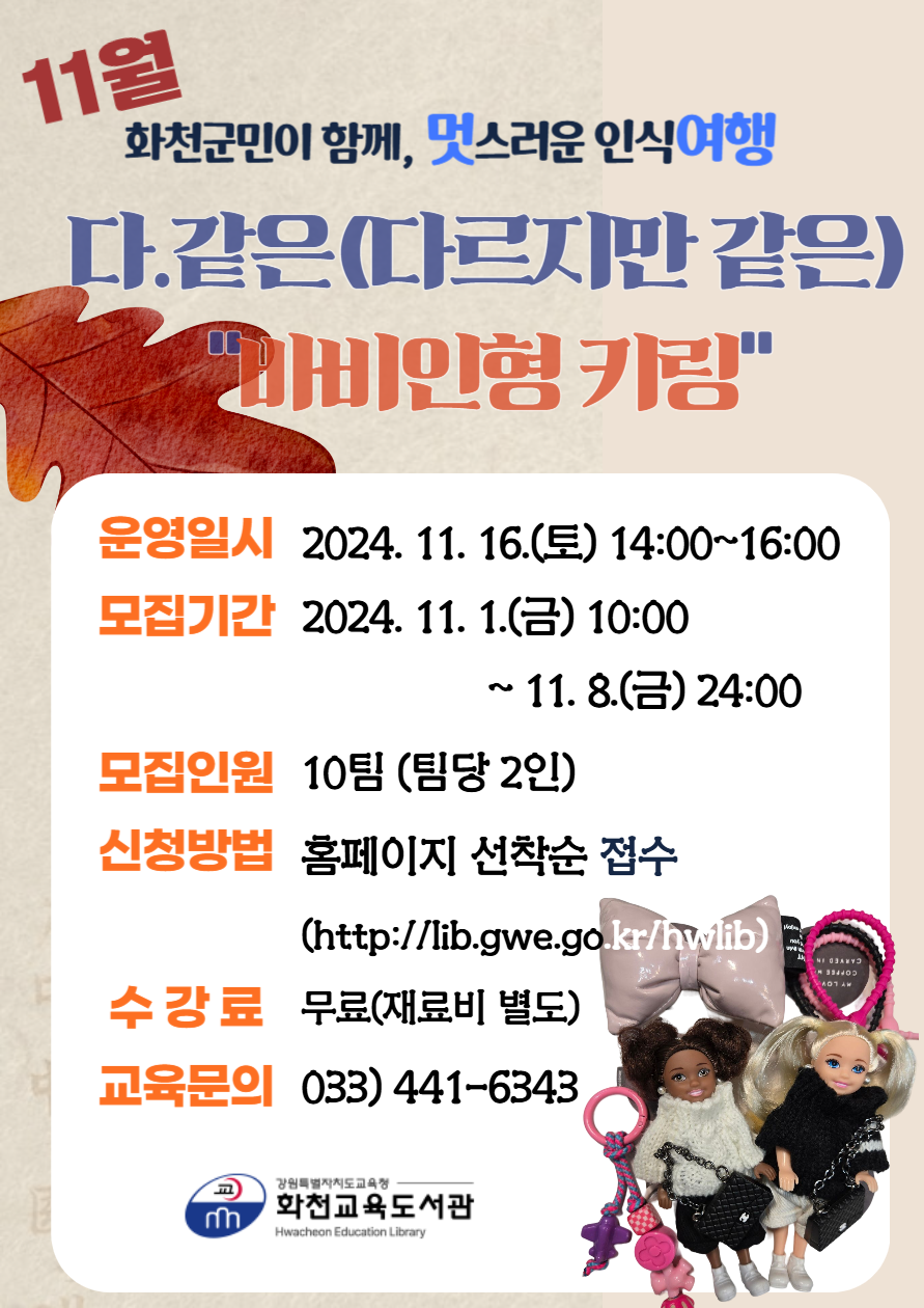 □ 화천교육도서관(관장 양재현)은 군민을 대상으로 2024년 11월 평생학습 주말 특강 「멋스러운 인식여행, “다.같은 바비인형 키링”」만들기를 체험한다.