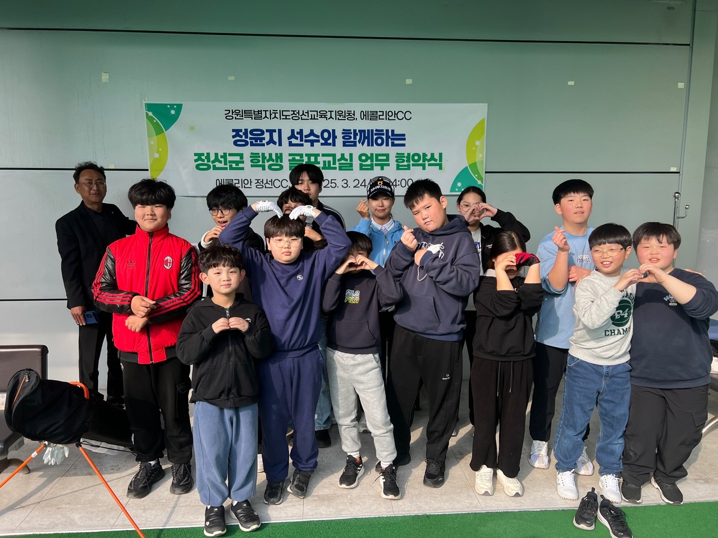 □ 2025. 3. 24.(월) 14:00~17:00, 에콜리안 정선CC에서 강원특별자치도정선교육지원청 지원과 에콜리안 정선CC의 협조, KLPGA 정윤지 선수 재능기부를 통한 정선 학생 골프교실 업무 협약식을 개최하였다. 본 협약에서는 정선군 관내 학생들에게 골프에 대한 양질의 레슨을 제공하기 위한 협약으로 에콜리안 정선CC에서는 연습장을 무료로 제공하고, 연 1회 이상 필드 라운딩을 할 수 있도록 협조하며, 정윤지 선수는 연 2회 무료 레슨을 시행하게 되었다.