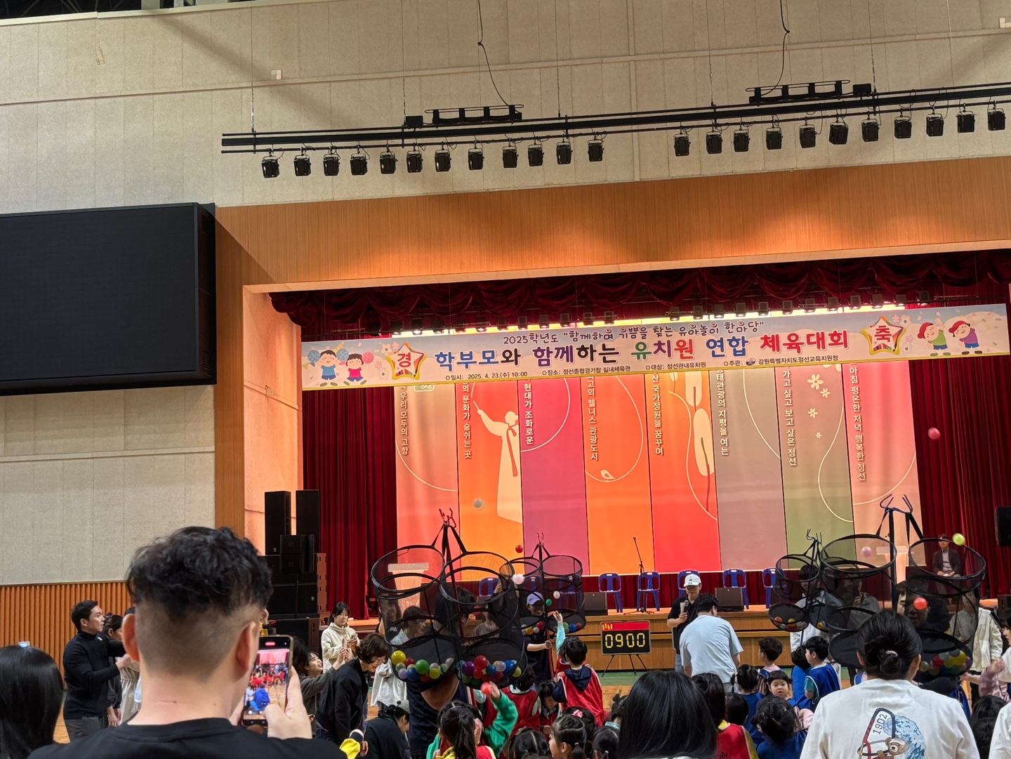 □ 강원특별자치도정선교육지원청(교육장 이하준)은 4월 23일(수) 오전 10시 정선군 종합운동장 실내체육관에서 관내 공립 단설·병설 유치원 원아 및 학부모 250여명을 대상으로 2025학년도 「학부모와 함께하는 유아 놀이체험 프로그램」을 운영하였다.