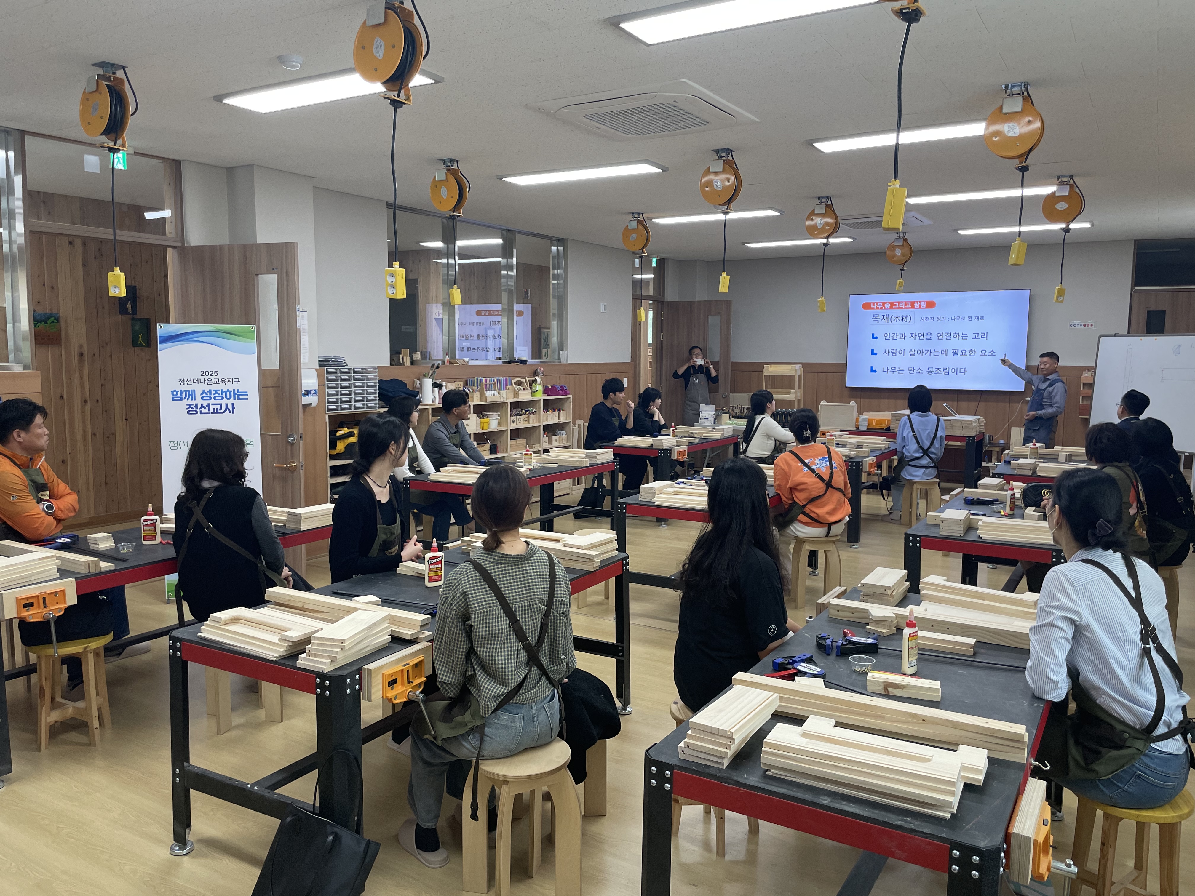 □ 지난 4. 24.(목) 첫 프로그램은 37명의 교원이 참여하여 정선목재문화체험장에서 진행된 목공체험 연수로 목재 특성을 이해하고 각종 공구 사용법을 익혀 직접 의자 책꼭이와 3단 수납장을 만드는 시간을 가졌다.
