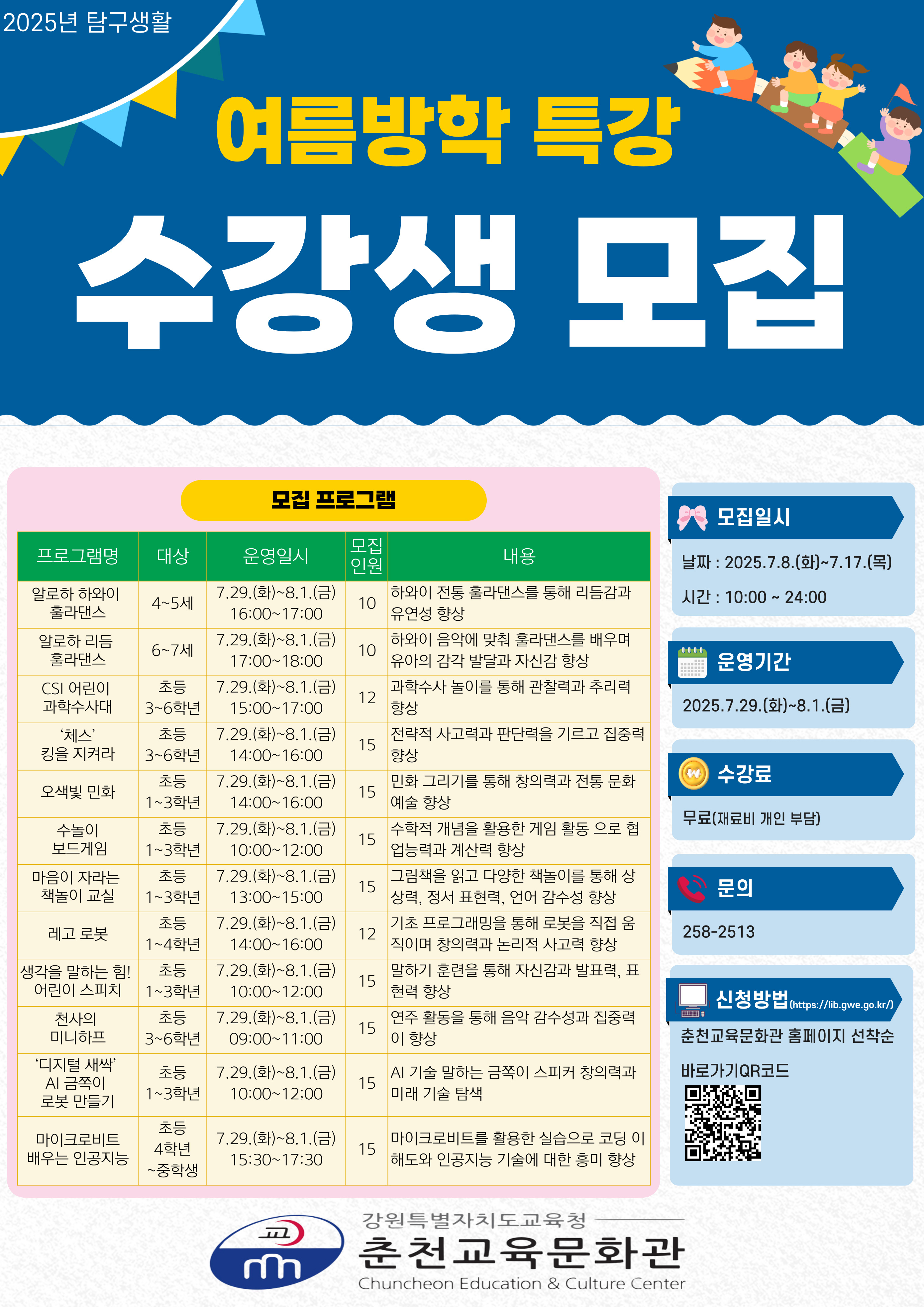 □ 춘천교육문화관(김선인 관장)은 7월 29일(화)부터 8월 1일(금)까지 춘천시민 유아 및 초등학생, 중학생을 대상으로 여름방학 특강을 운영한다.
