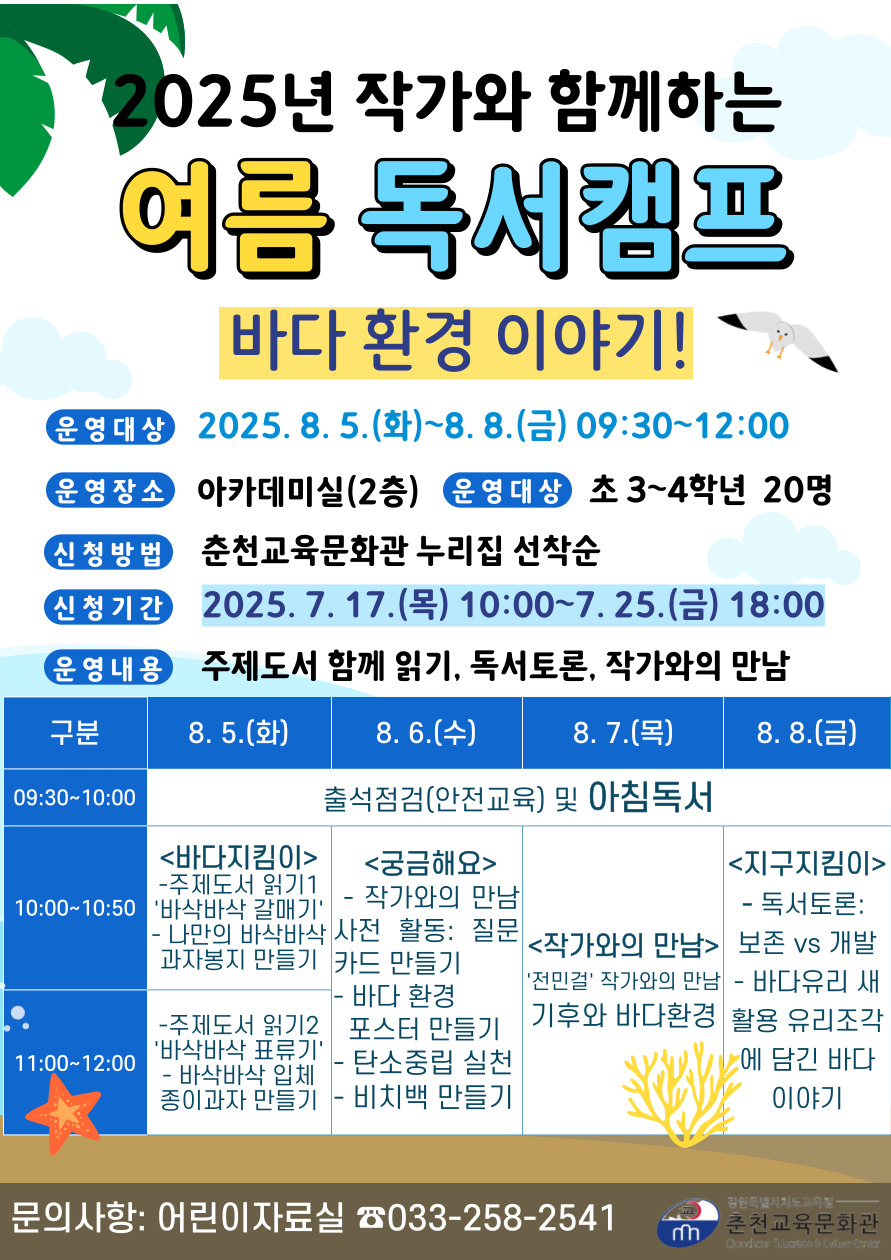 □ 이번 여름 독서캠프는 ‘바다 환경 이야기’를 주제로 해양 오염, 생태환경에 관한 그림책을 읽고, 작가와의 만남을 진행할 예정이다. 주제 도서는 전민걸 작가의 그림책 『바삭바삭 표류기』로, 바다 오염과 해양생태계의 심각성을 담은 그림책이다.