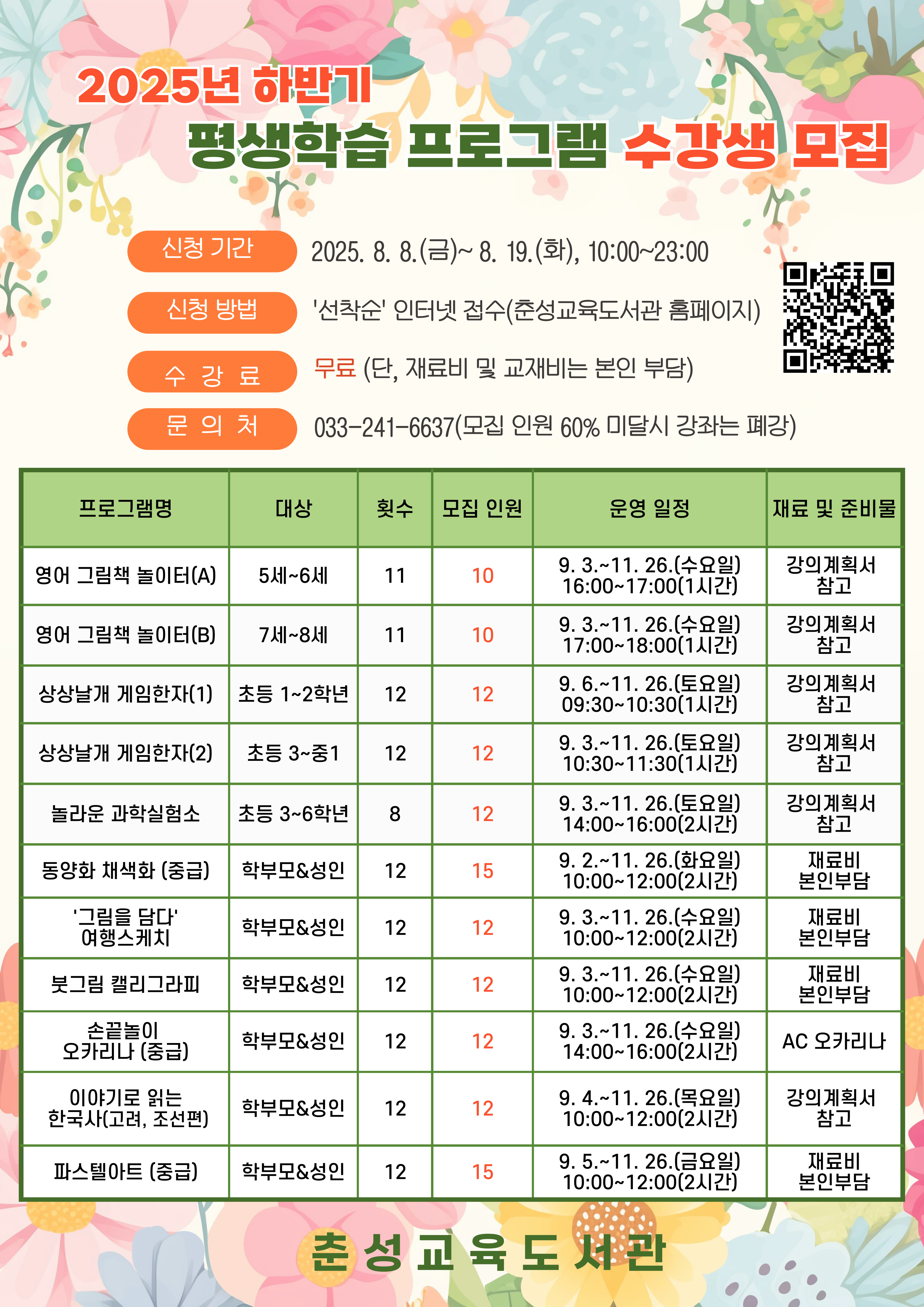 □ 춘성교육도서관(관장 이은화)은 “문화·예술·체험 및 행복한 삶”을 위한『2025년 하반기 평생학습강좌』를 운영한다. 유아, 학생, 학부모, 소외계층 등 다양한 프로그램과 대상으로 수강생을 모집한다.