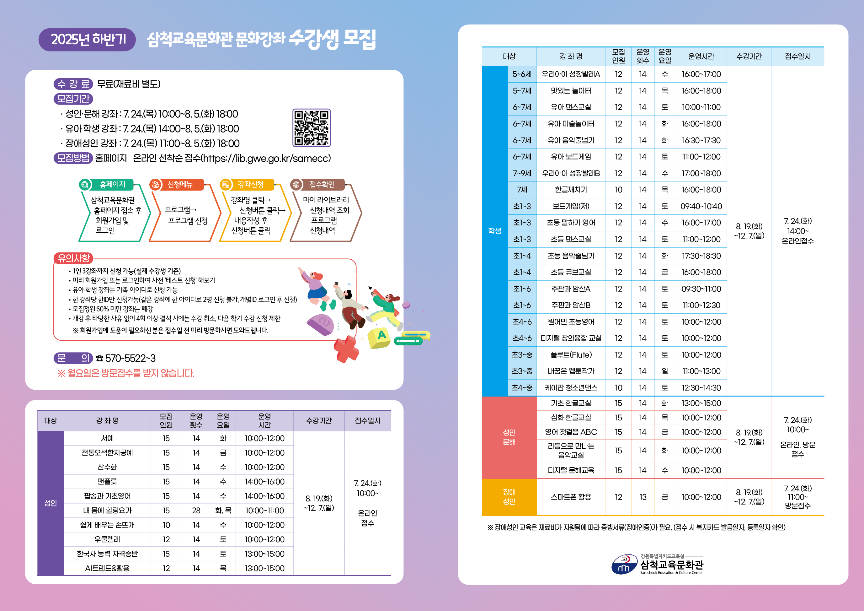 □ 자세한 내용은 삼척교육문화관 누리집(https://lib.gwe.go.kr/samecc/)을 참고하거나 전화(☎ 570-5522~3)로 문의하면 된다.