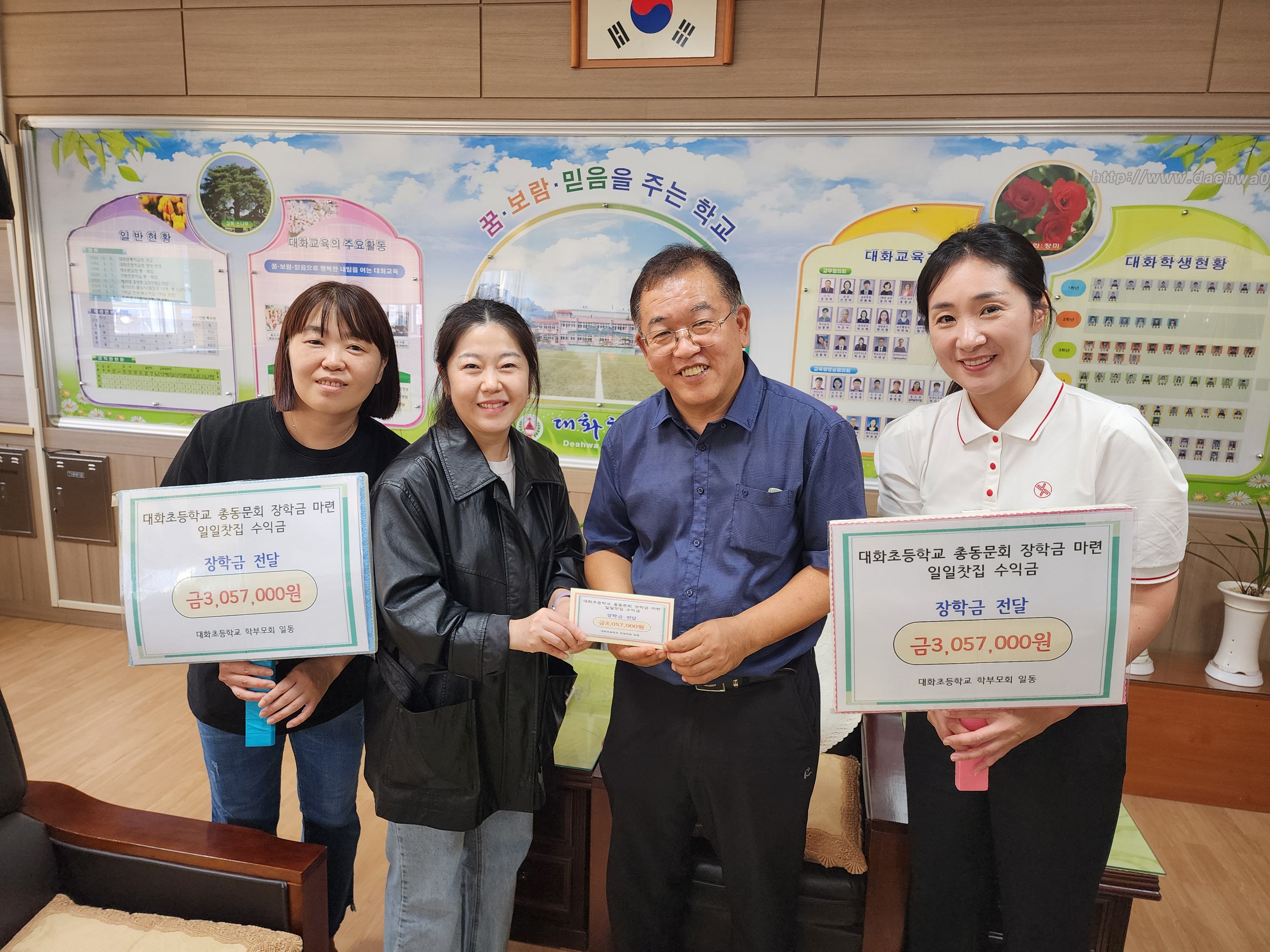 모금된 수익금 전액 3,057,000원(삼백여만원)을 학생 장학금으로 전달하였으며 일일찻집을 통해 모금된 수익금 전액은 전교생을 위한 장학금과 학생복지 지원으로 사용될 예정입니다. 대화초등학교 학부모회장(박명희)은 "학생들이 더 좋은 환경에서 꿈을 키워나갈 수 있도록 이번 행사를 기획했다"며 "모두의 따뜻한 마음이 모여 아이들에게 큰 힘이 될 것"이라고 말했습니다. 홍영래 교장은 "학부모님들의 헌신적인 노력과 총동문회와 지역사회의 관심에 깊이 감사드린다"며 "학생들이 배려와 나눔의 가치를 배우고 건강하게 성장할 수 있도록 지원을 아끼지 않겠다"고 전했습니다.