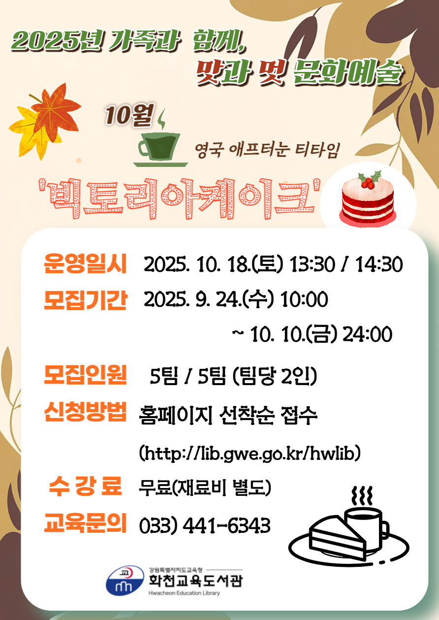 □ 화천교육도서관(관장 류은선)은 군민을 대상으로 2025년 10월 주말 특강 「함께하니 맛나는 세계음식 문화체험, 영국 애프터눈 티타임“빅토리아케이크”」를 운영한다.