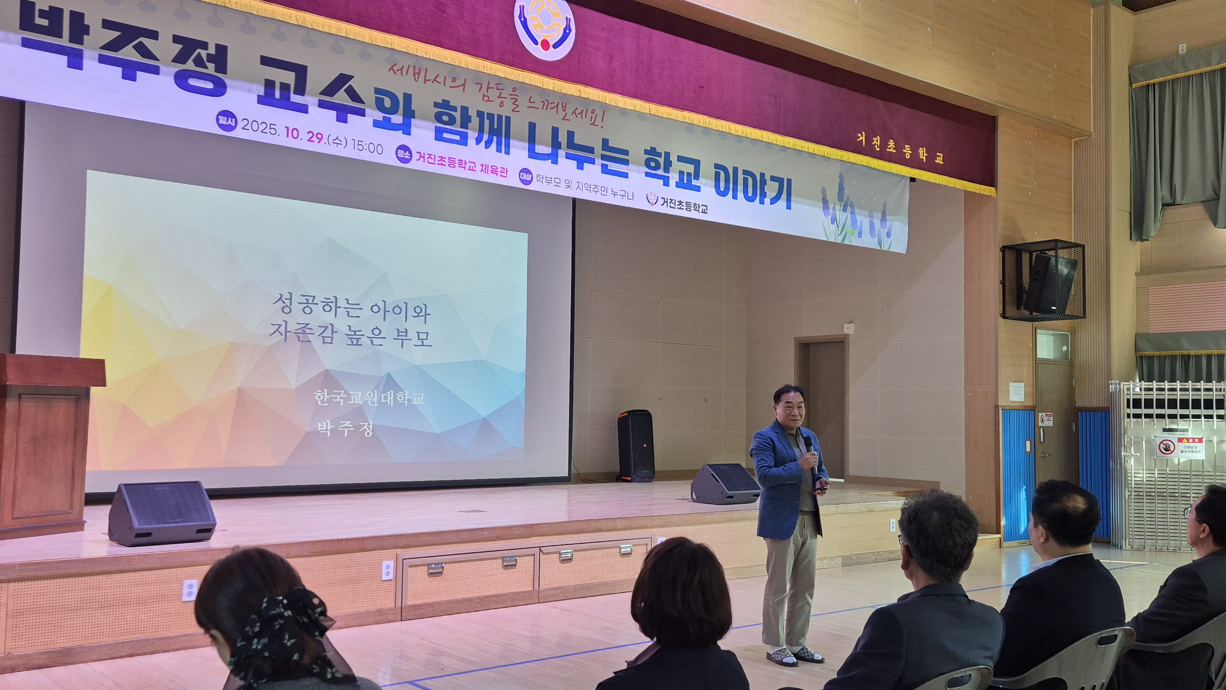 거진초등학교(교장 신성규)은 10월 29일(수) 본교 체육관에서 박주정 한국교원대학교 교수를 초청해 ‘박주정교수와 함께 나누는 학교 이야기!’를 주제로 특강을 개최했다.