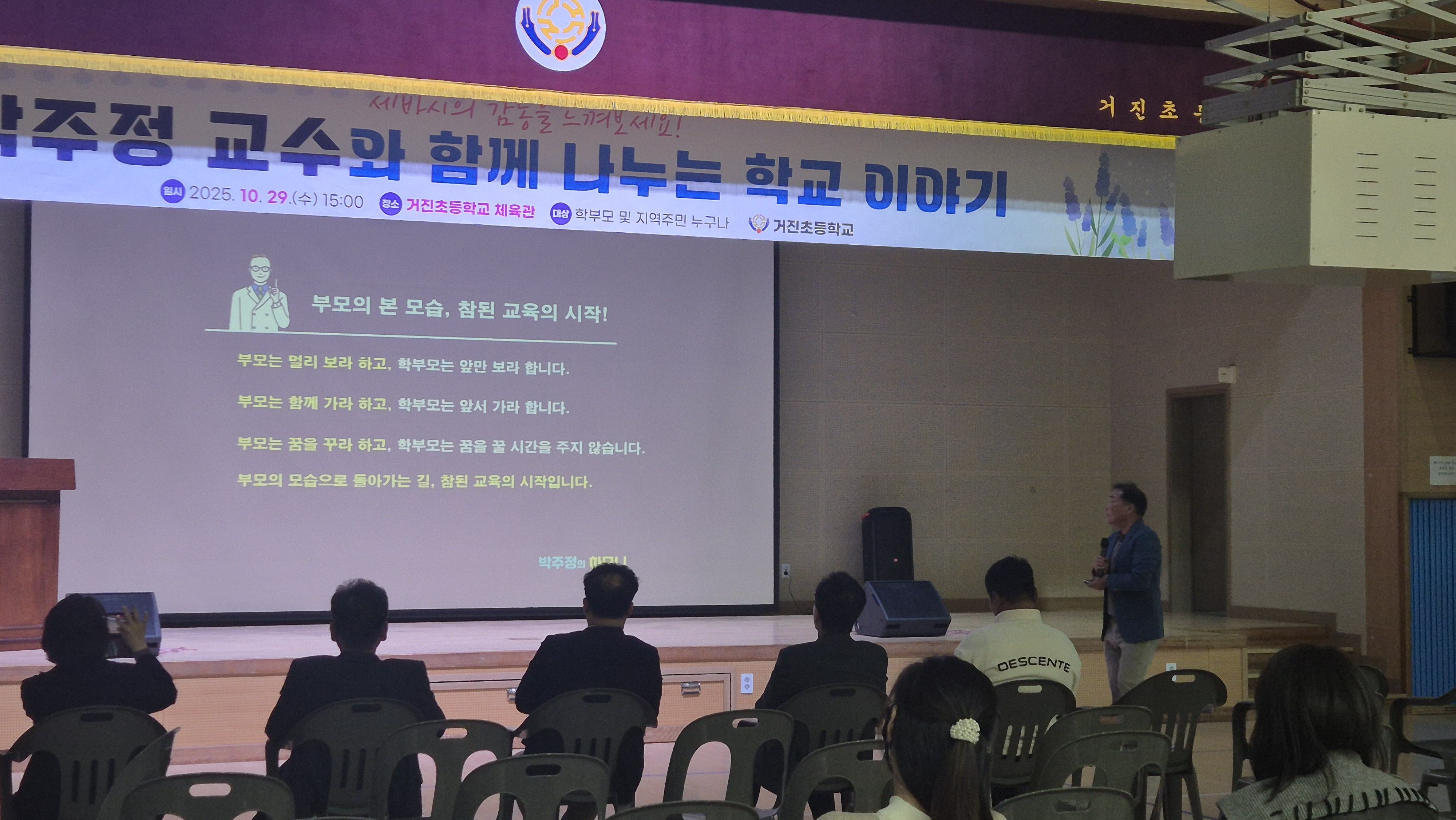 이번 강연은 학고서교・학부모・지역사회가 함께 참여하는 교육공동체 분위기 조성의 일환으로, 거진초등학교 학부모 및 지역주민, 강원특별자치도고성교육지원청 산하 교직원 100여명이 참석해 성황을 이뤘다. 강연자는 전 광주광역시 서부교육지원청 교육장을 역임한 박주정 교수로, ‘선생 박주정과 707명의 아이들’의 저자로도 잘 알려져 있다.